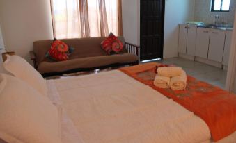 Mata Te Ki Rangi Cabanas are somewhat primitive but spacious apartments with a nice terrace in front and green surroundings. The place is located 3 km from the town with its shopping and restaurants, so many will likely depend on a car (or taxi) to get something to eat. We walked back and forth once a day, and it worked fine. There are no toiletries or kitchen essentials, so everything must be purchased or brought along. At dawn, the area's dogs and roosters go crazy in a noise orgy that could wake the dead. Remember earplugs! The place's wifi comes and goes as the wind blows. Communication with the host is a bit difficult, as she is often away for several days at a time (we never actually met her, only the taciturn driver who picked us up at the airport). The best feature of these cabanas is the solitary, very soulful, and thoughtful moai that stands 7 minutes down the road towards the Pacific Ocean.