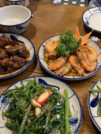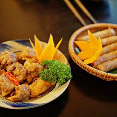 There is a Vietnamese restaurant next to the hotel where I stayed. Every day when I pass by, I can see many Koreans eating there. The restaurant has been carefully decorated and looks a bit romantic. One night, I passed by early and there were not many customers, so I went in and ordered four dishes. The ribs are a little sweet, similar to the taste of sweet and sour ribs. The shrimps are fried with peppers and onions. There are not many shrimps and they are relatively fresh. Paper spring rolls are a classic dish in Vietnam. The ones here are as long as the palm of your hand and wrapped in lettuce. The four dishes cost only 400,000 Vietnamese dong, which is equivalent to more than 110 yuan, which is still cheap.