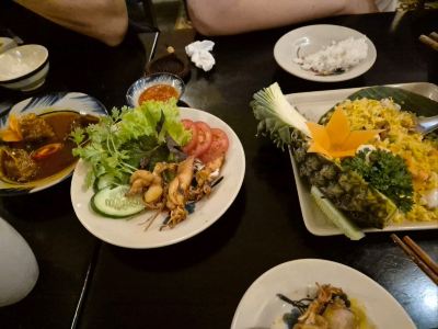 实在不可爱There is a Vietnamese restaurant next to the hotel where I stayed. Every day when I pass by, I can see many Koreans eating there. The restaurant has been carefully decorated and looks a bit romantic. One night, I passed by early and there were not many customers, so I went in and ordered four dishes. The ribs are a little sweet, similar to the taste of sweet and sour ribs. The shrimps are fried with peppers and onions. There are not many shrimps and they are relatively fresh. Paper spring rolls are a classic dish in Vietnam. The ones here are as long as the palm of your hand and wrapped in lettuce. The four dishes cost only 400,000 Vietnamese dong, which is equivalent to more than 110 yuan, which is still cheap.Outstanding