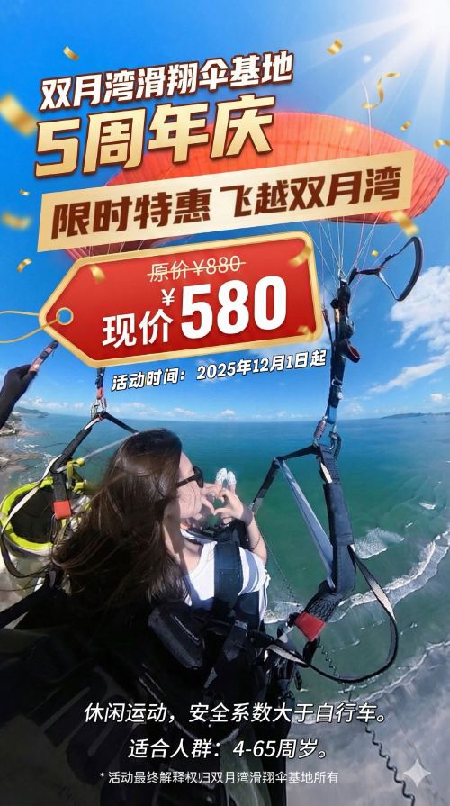 1. Participants must be between 5 and 60 years old, weigh no more than 90 kg, and have no history of high blood pressure, heart disease, coronary heart disease, severe acrophobia, epilepsy, or vertigo. The club reserves the right to refuse Paragliding activity to travelers with the aforementioned conditions or those unsuitable for outdoor extreme sports.