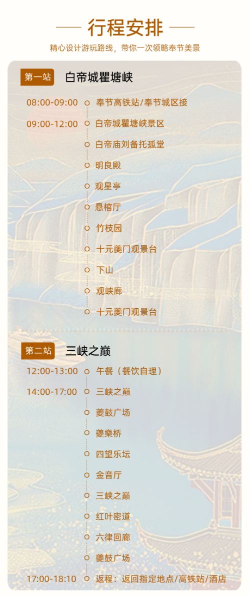 2. You need to purchase round-trip high-speed rail tickets from Chongqing to Fengjie County on your own. To ensure sufficient time for sightseeing, we recommend arriving at Fengjie Station before 9:00 AM. For the return trip, we suggest purchasing train numbers departing after 18:00. Train numbers arriving before 10:00 AM can also be accommodated, but for the return trip, we recommend purchasing train numbers departing after 19:00.