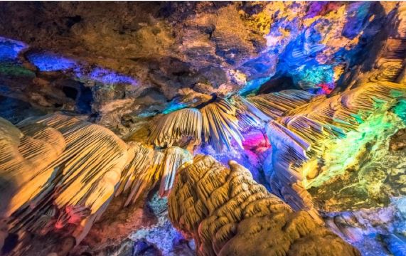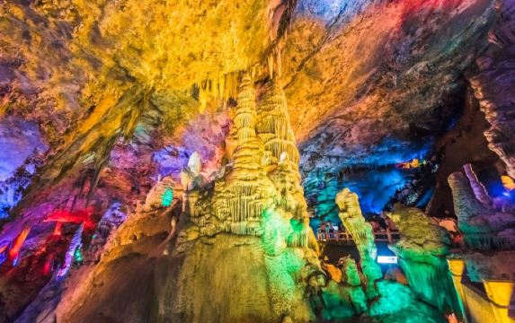 ▲ Ji Guan Cave, dating back approximately 600 million years, features an ever-flowing underground river gushing through rock crevices. The spacious cavern is adorned with dazzling stalactites hanging from the ceiling and stalagmites dotting the ground, creating a spectacular sight. Highlights include formations like "Crocodile Paying Tribute to Longevity" and "White Tiger Pulling the Jade Peak." The cave boasts rows of stone draperies on the ceiling, expansive hanging stalactites, and orderly arranged stalagmites on the floor, presenting remarkable views such as "Stacked Arhats," "Waiting Wife Stone," "Drunken Arhat," and "General Stone." The cave walls are embellished with exquisite snowflake-like stone flowers, leaving visitors in awe.