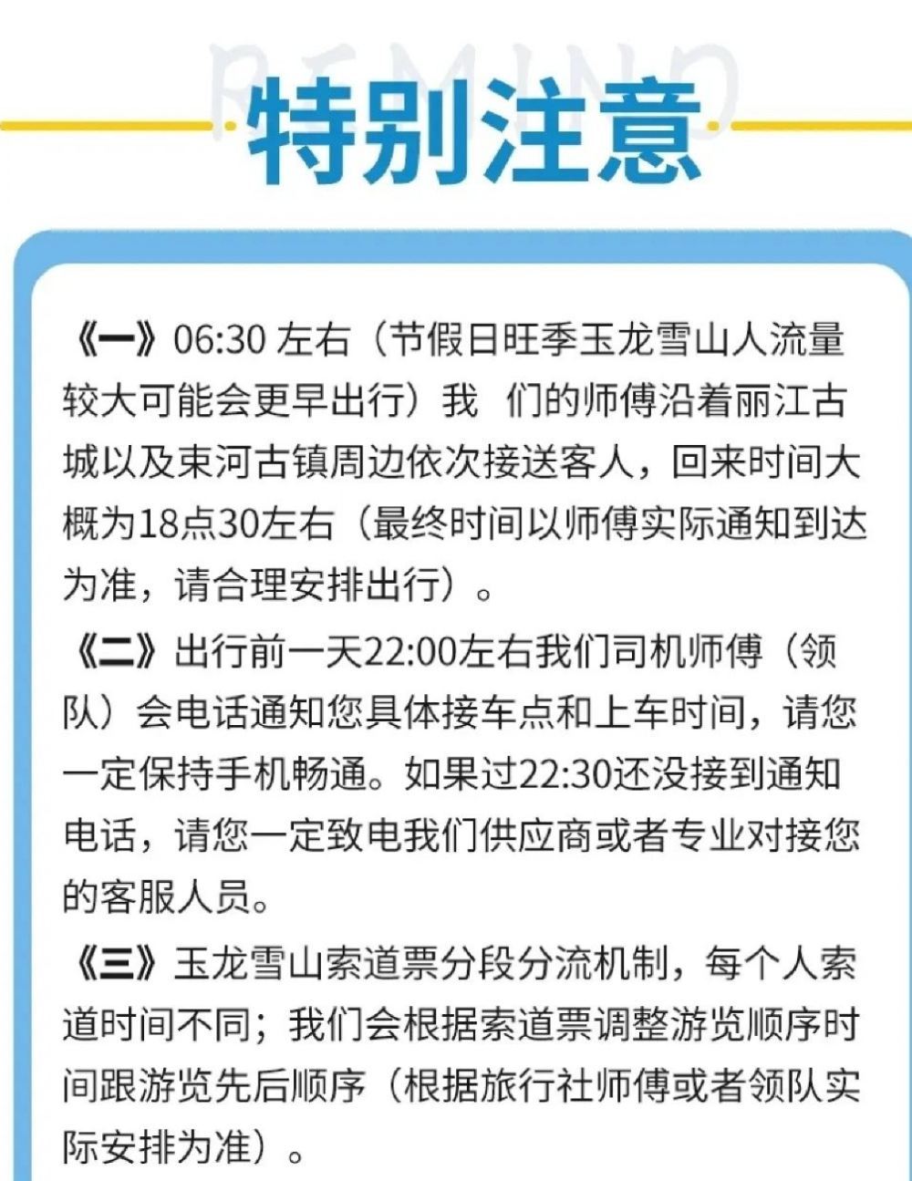 2. Our driver will call you around 10 PM the night before your trip to confirm the departure time and pick-up point for the next day. If you haven't received any notification by then, please contact customer support immediately. For international guests, please provide a WeChat account or mainland China phone number for contact after booking, as other contact methods are currently not supported. Communication with the driver will rely on WeChat's auto-translation or translation software. If this is not acceptable to you, please refrain from booking. Thank you!