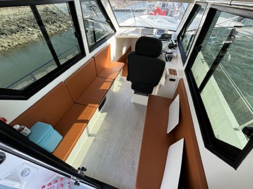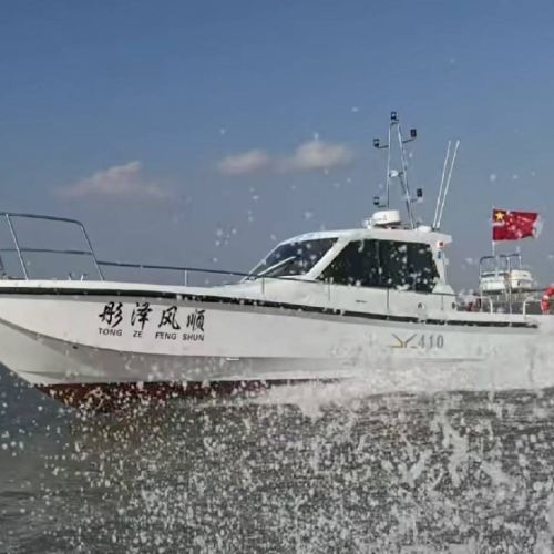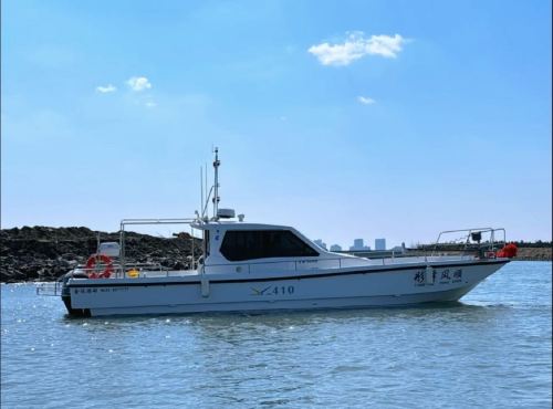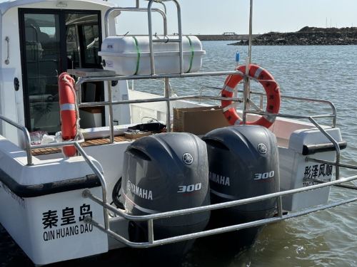 The boat is 12.86 meters long, can carry 12 passengers, and is equipped with two 300-horsepower engines.