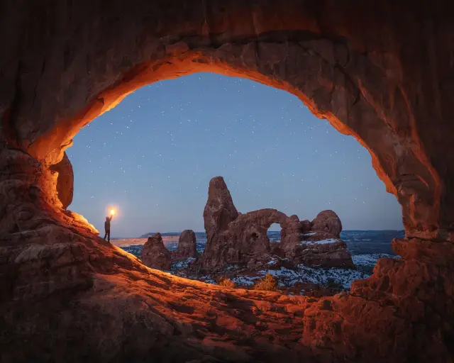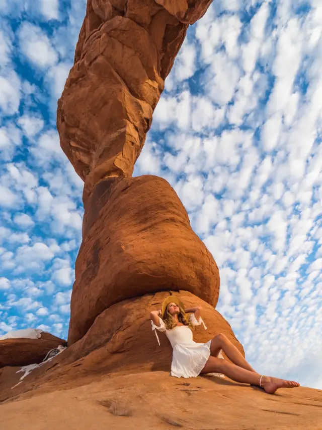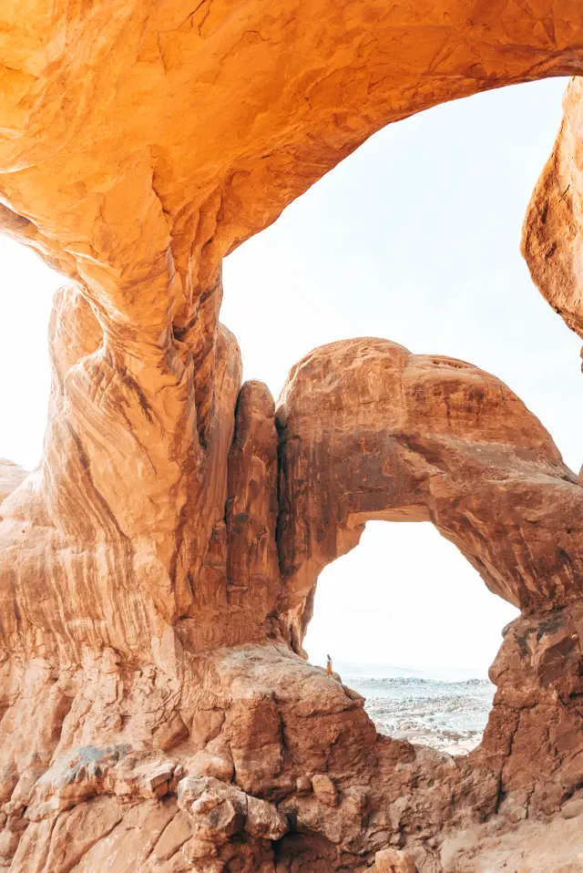 We headed to Arches National Park, home to the world's largest concentration of sandstone arches. Spanning over 70,000 acres, it boasts hundreds of natural rock arches, each with its own unique shape. It's up to your imagination to decide what to create. The eye-shaped arch is the most famous, Delicate Arch, and according to our guide, it's also the state symbol of Utah. Having just visited Monument Valley the day before, I wasn't particularly impressed by the arches in the same color scheme. Perhaps I'm a bit tired of it. 😁 However, I was intrigued by the thick white snow piled on the rocks. It's hard to say, we're from the South. 😂